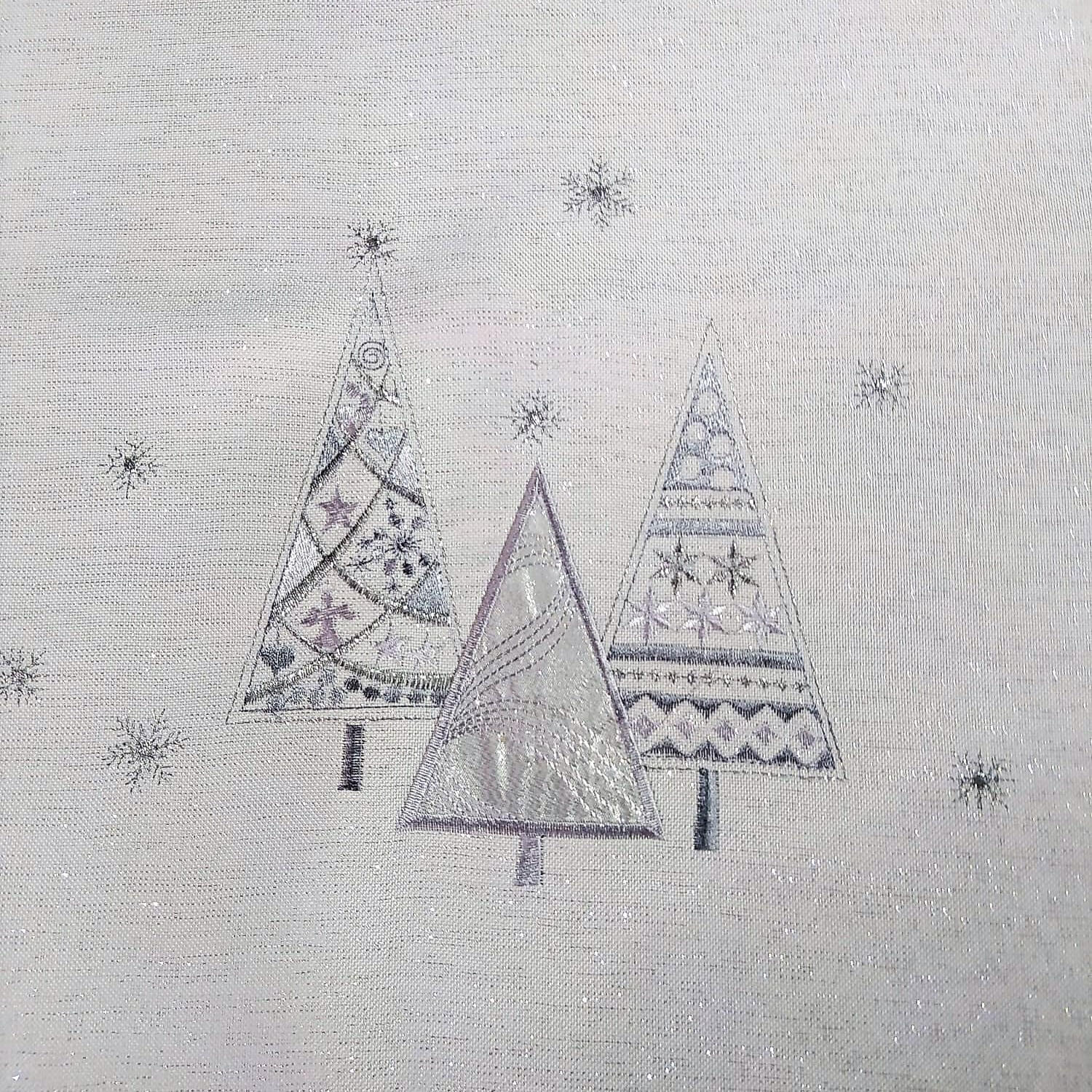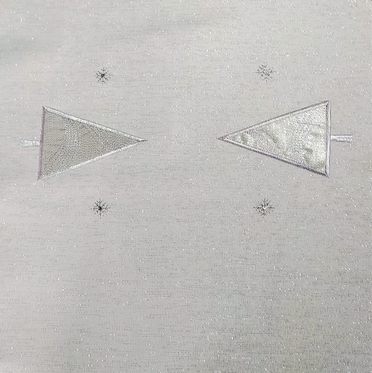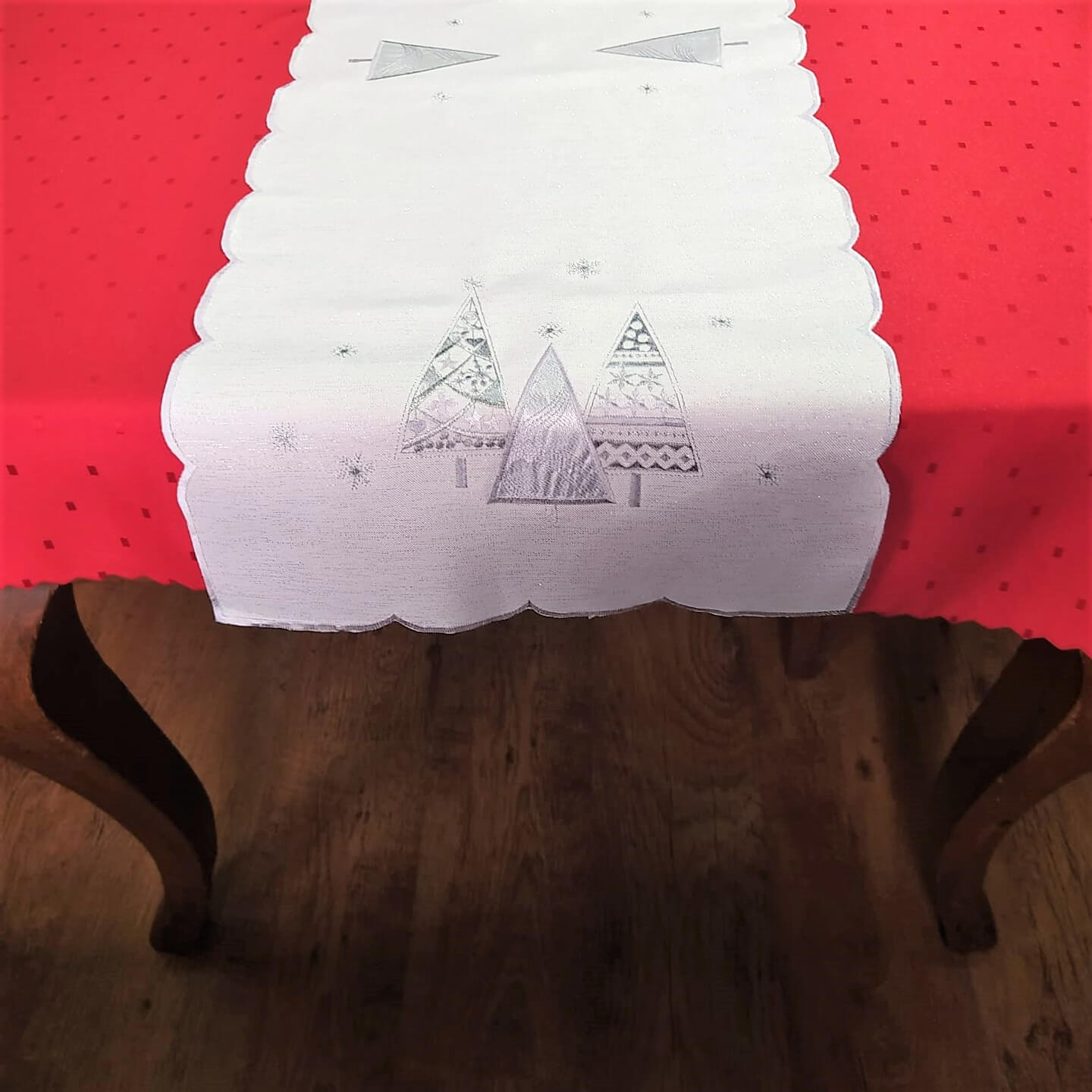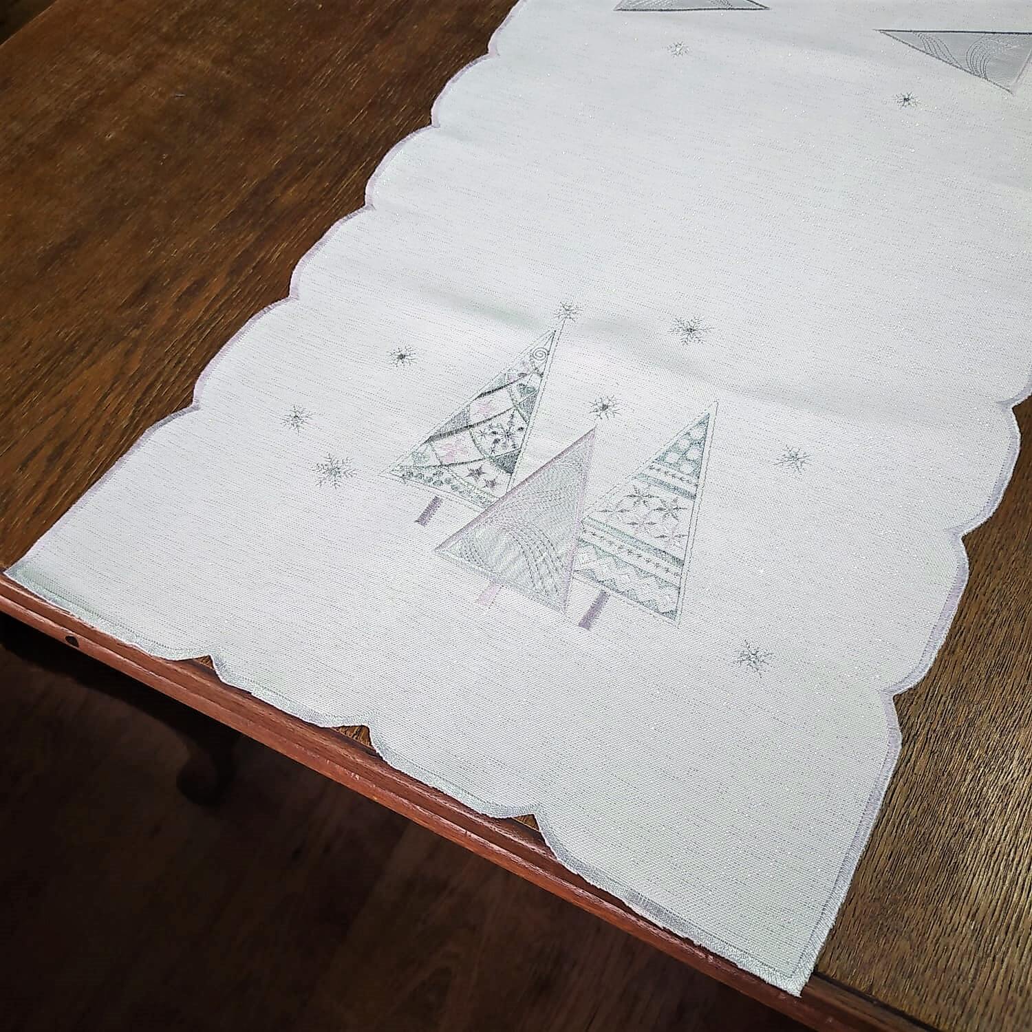 Bieżnik świąteczny 40x300 w kolorze białym z wyhaftowanymi srebrnymi geometrycznymi choinkami