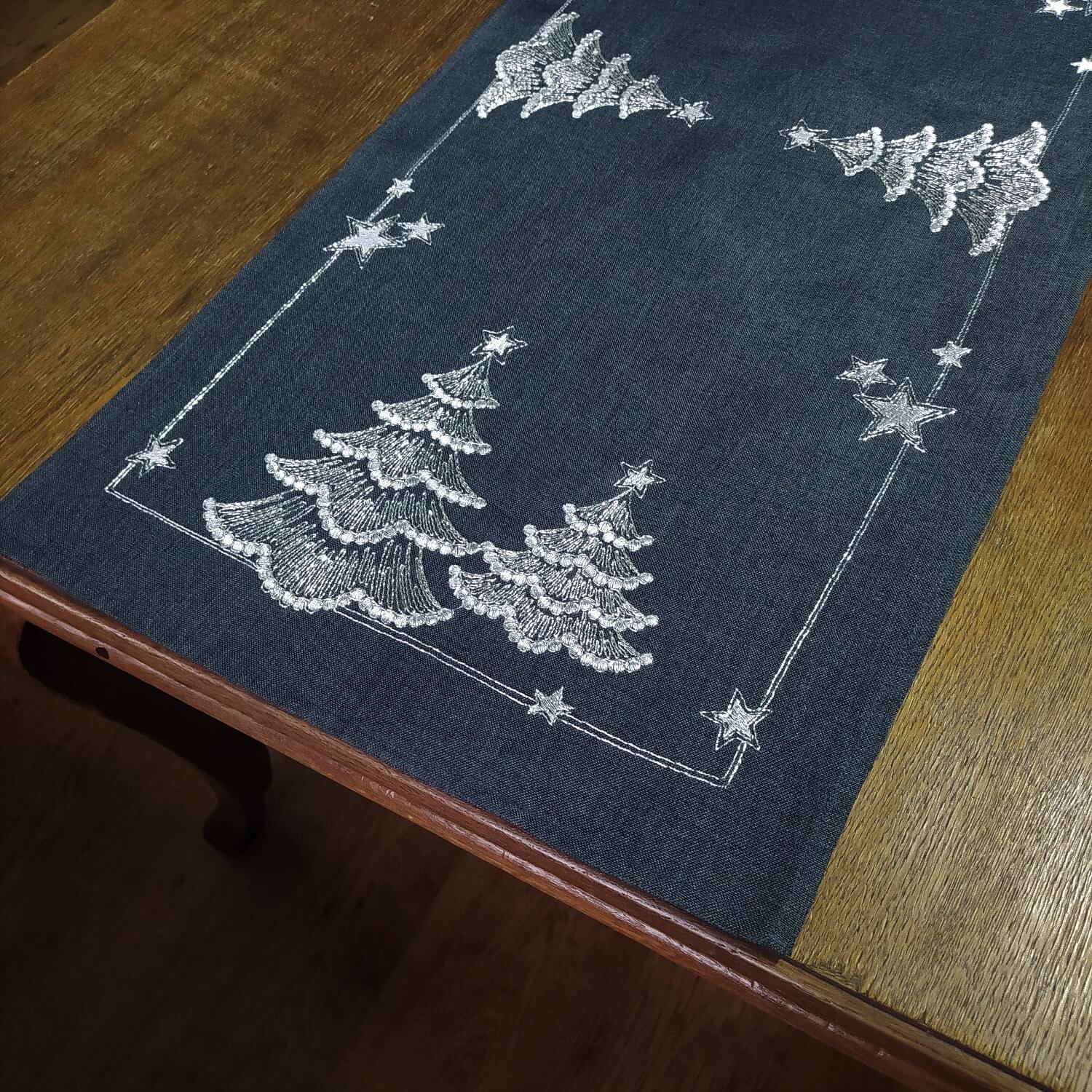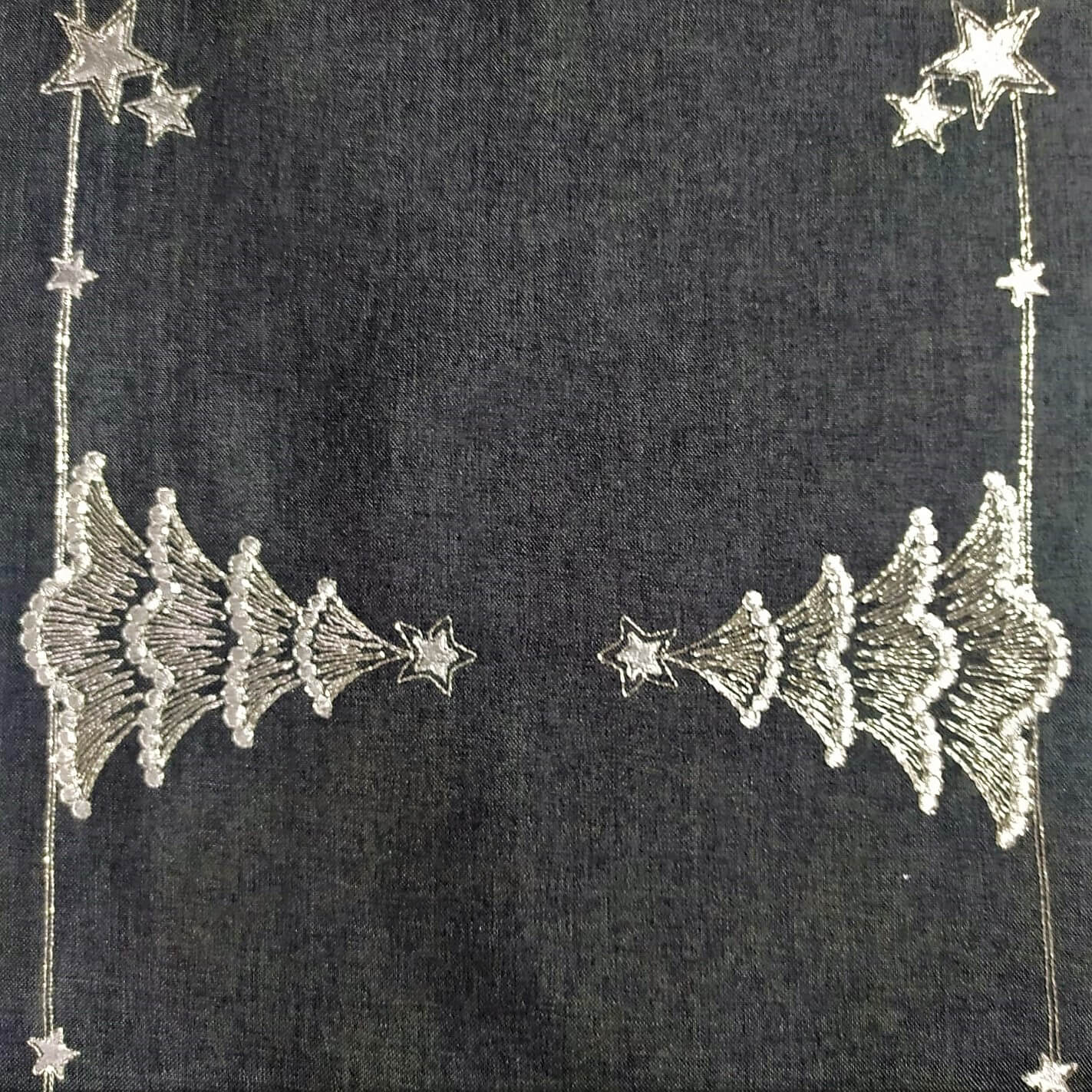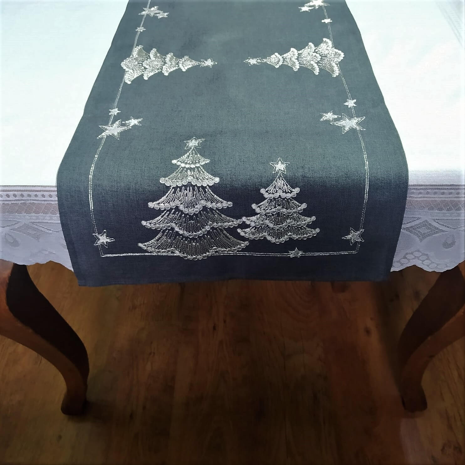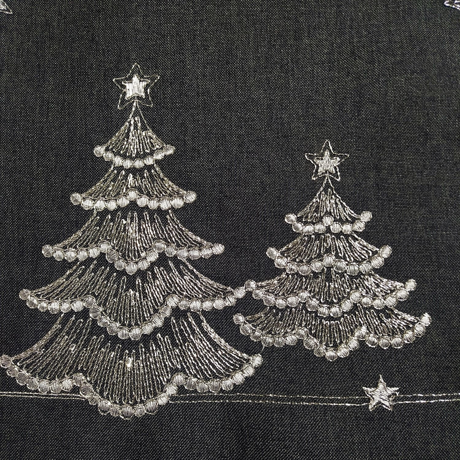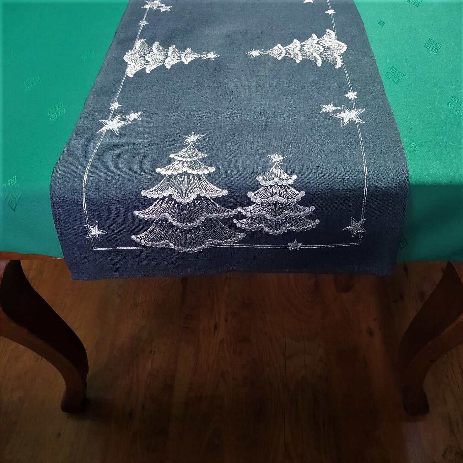 Bieżnik świąteczny 40x300 w kolorze grafitowym z wyhaftowanymi srebrnymi choinkami