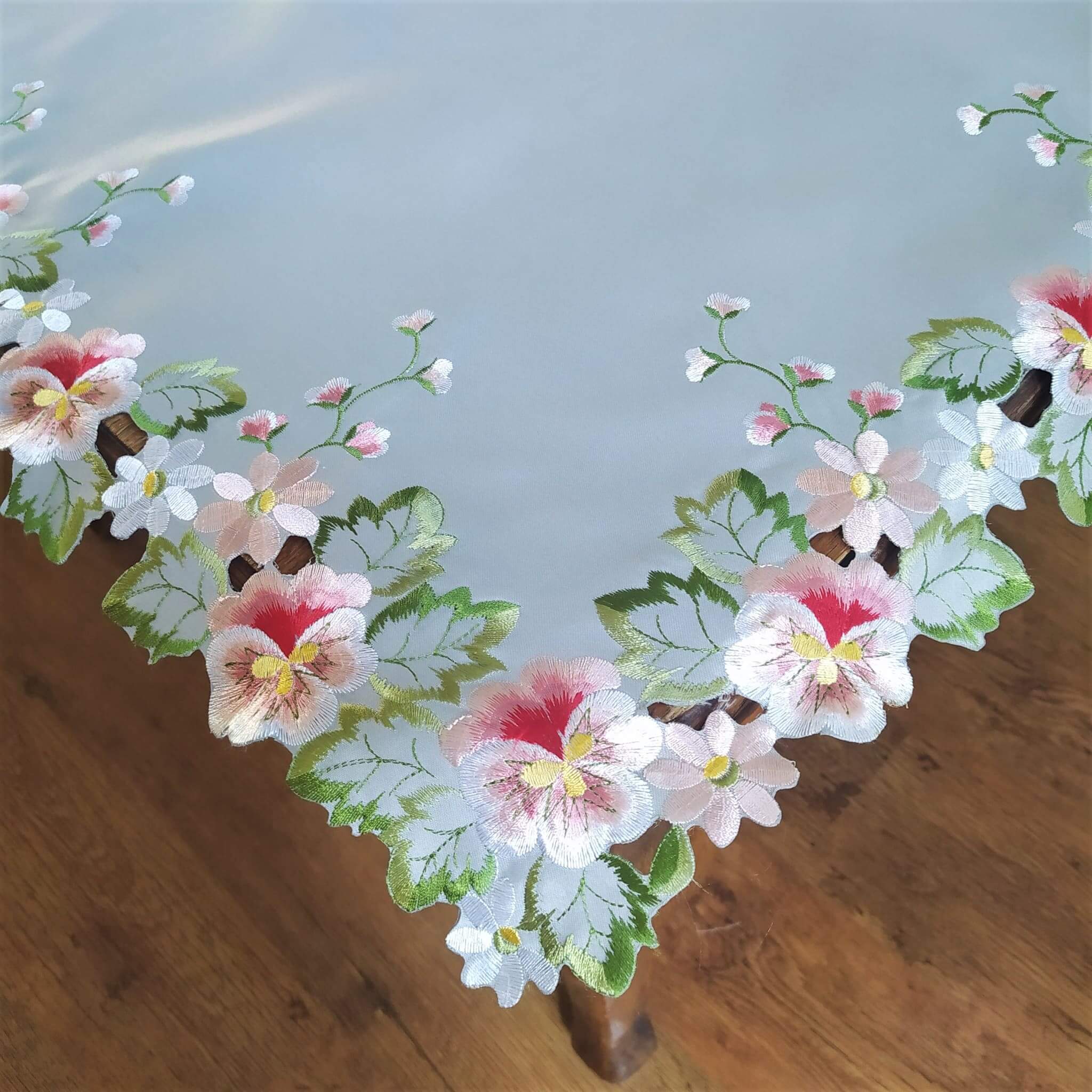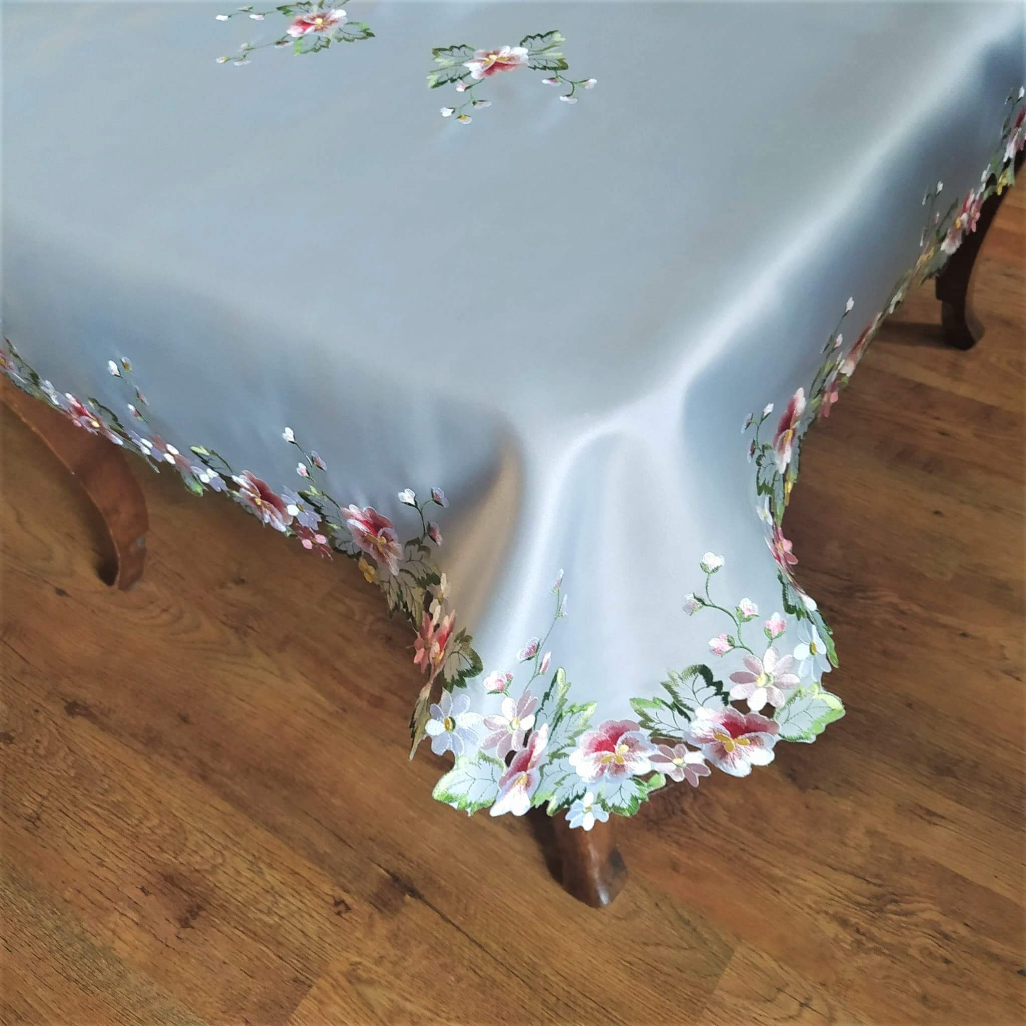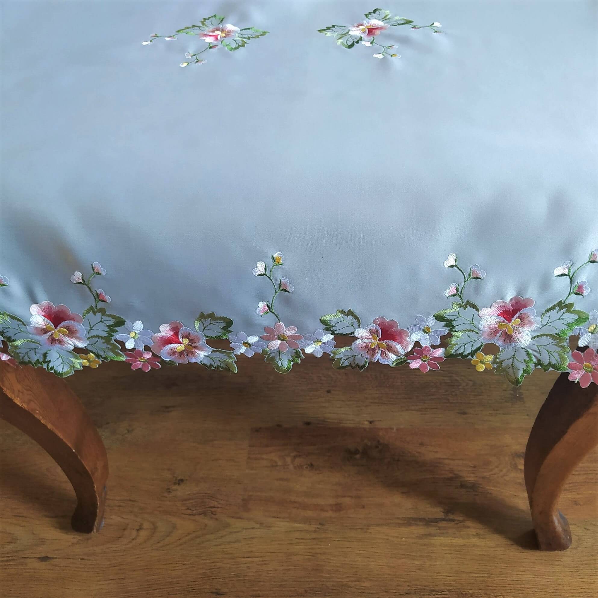 Prostokątny obrus 130x180 w kolorze popielatym z wyhaftowanymi bratkami.