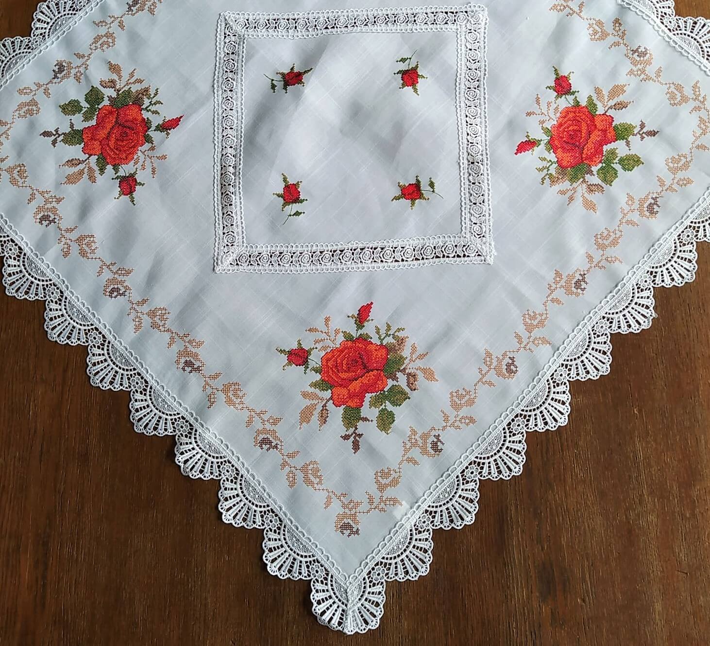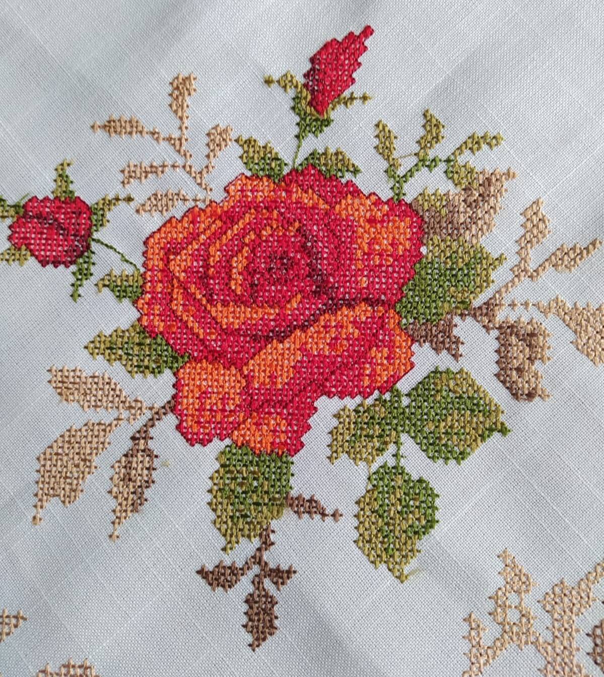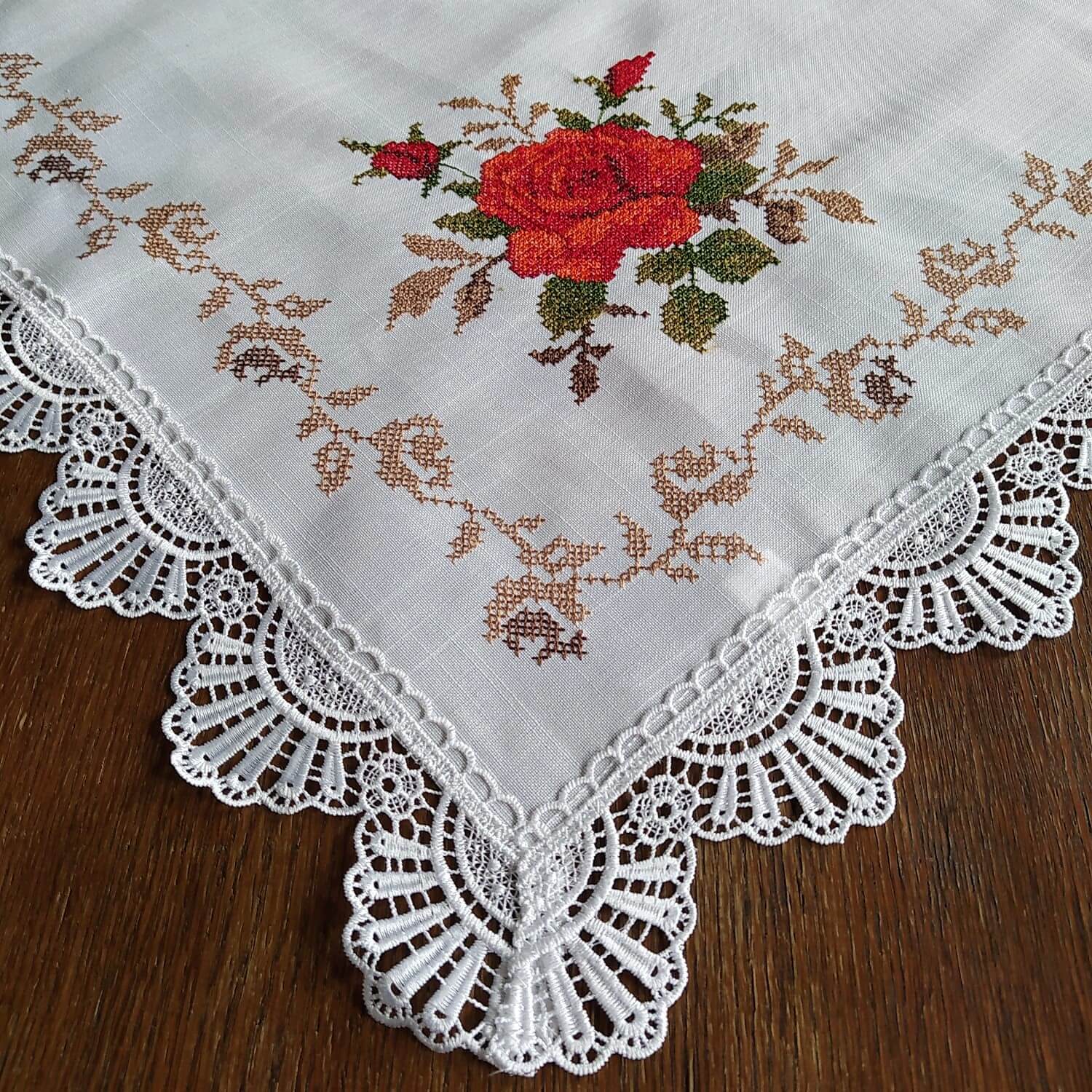 Kwadratowa serweta 85x85 w kolorze białym z czerwonymi różami. Materiał przypomina płótno.