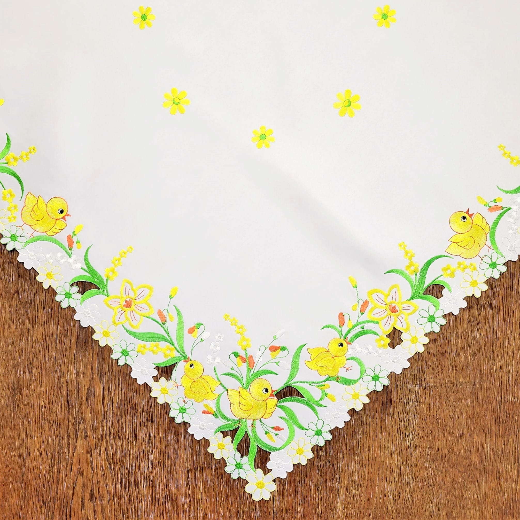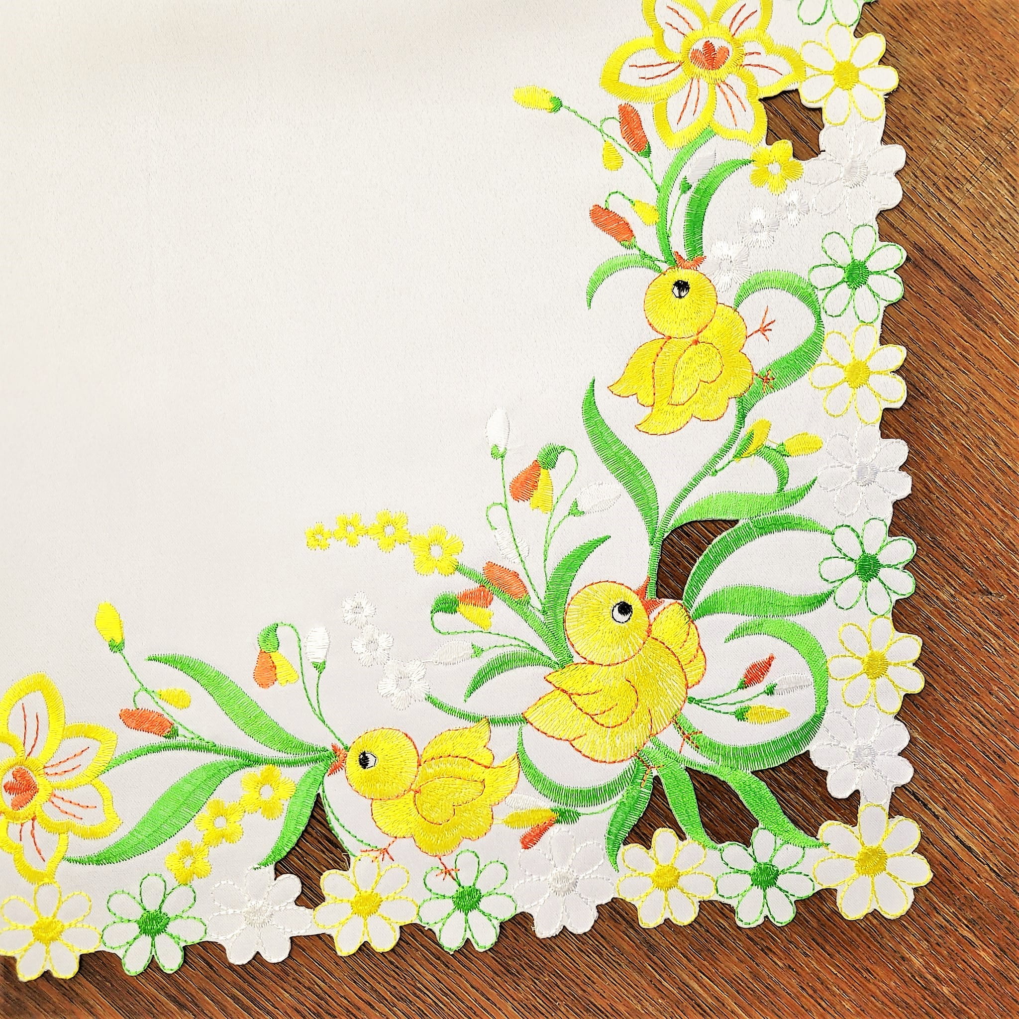 Wielkanocna serweta 85x85 w kolorze kremowym z wyhaftowanymi pisklaczkami i żonkilami