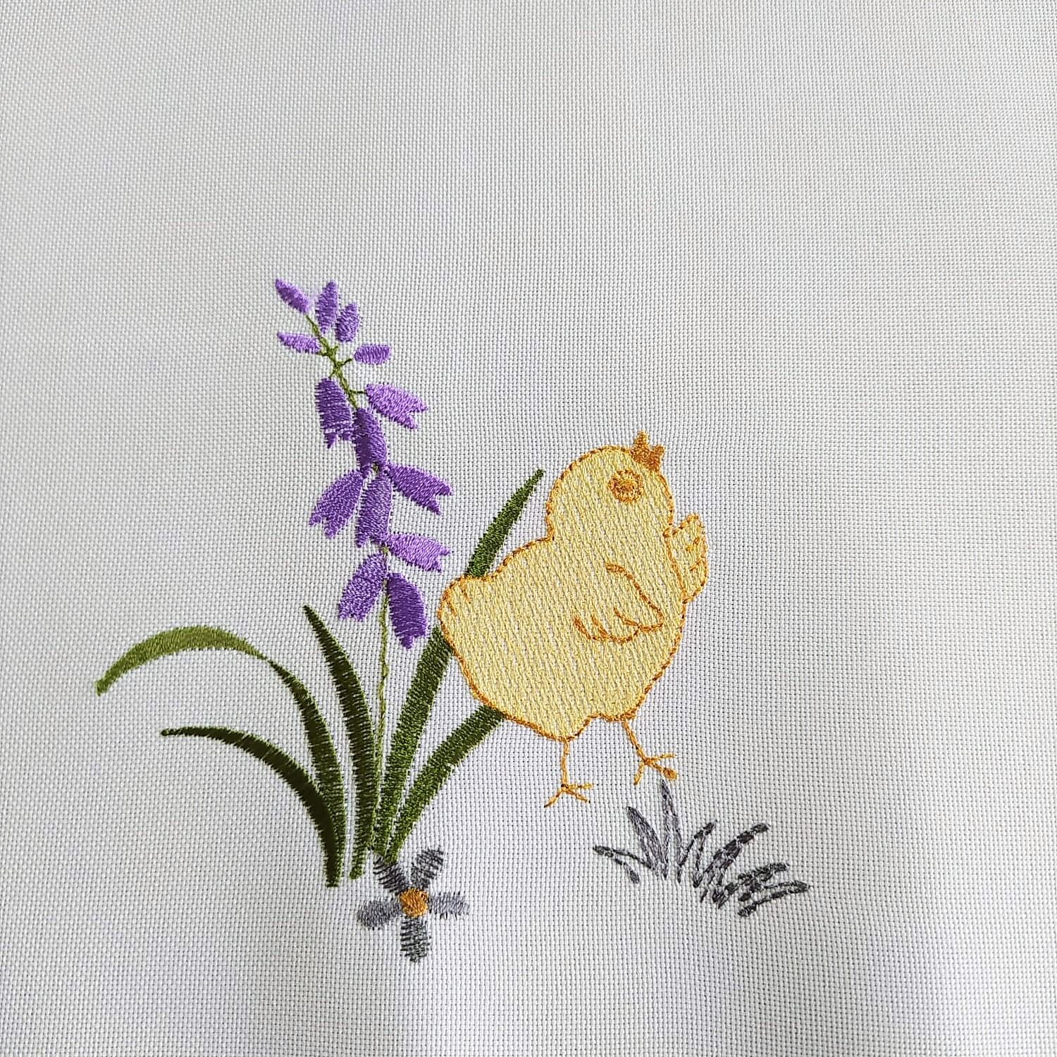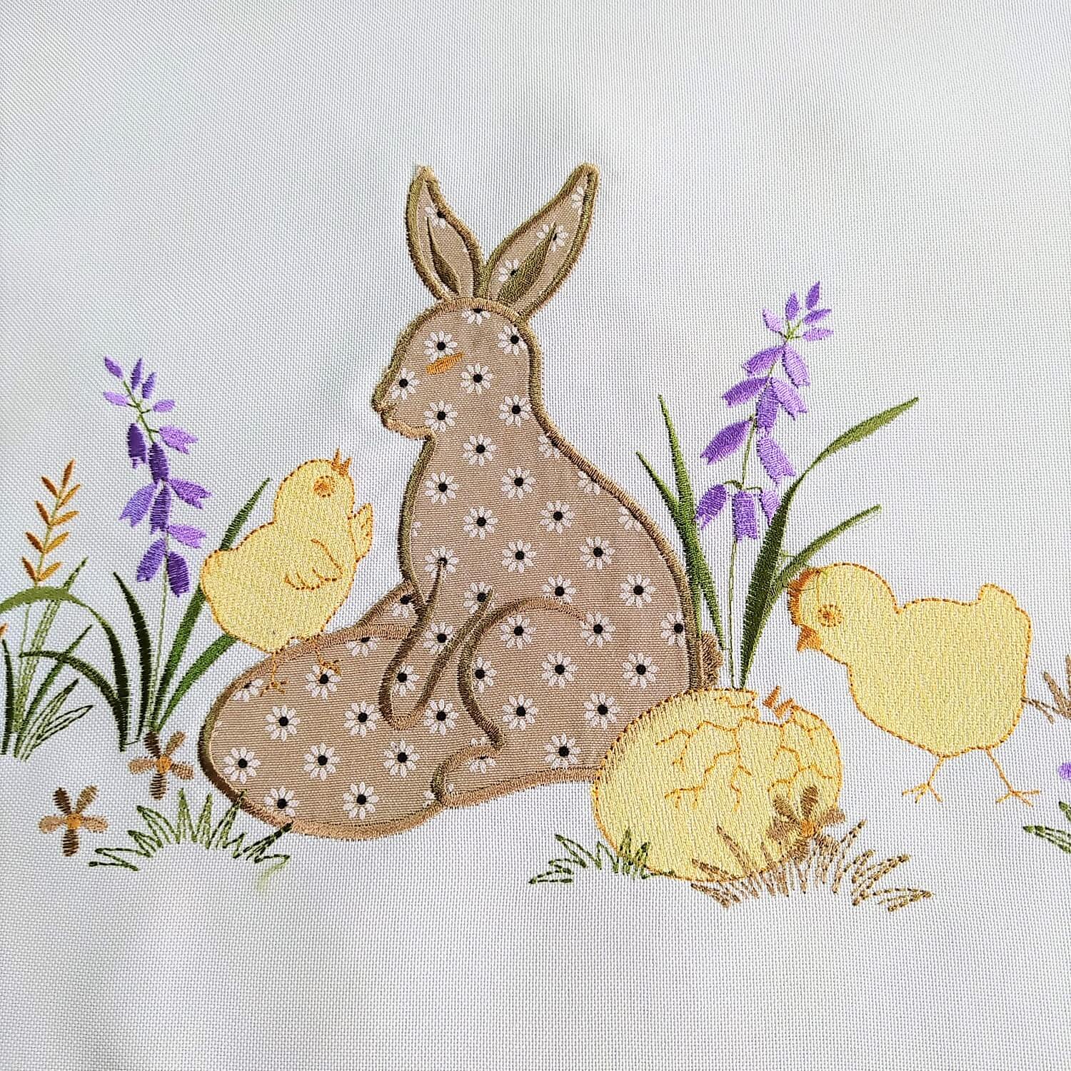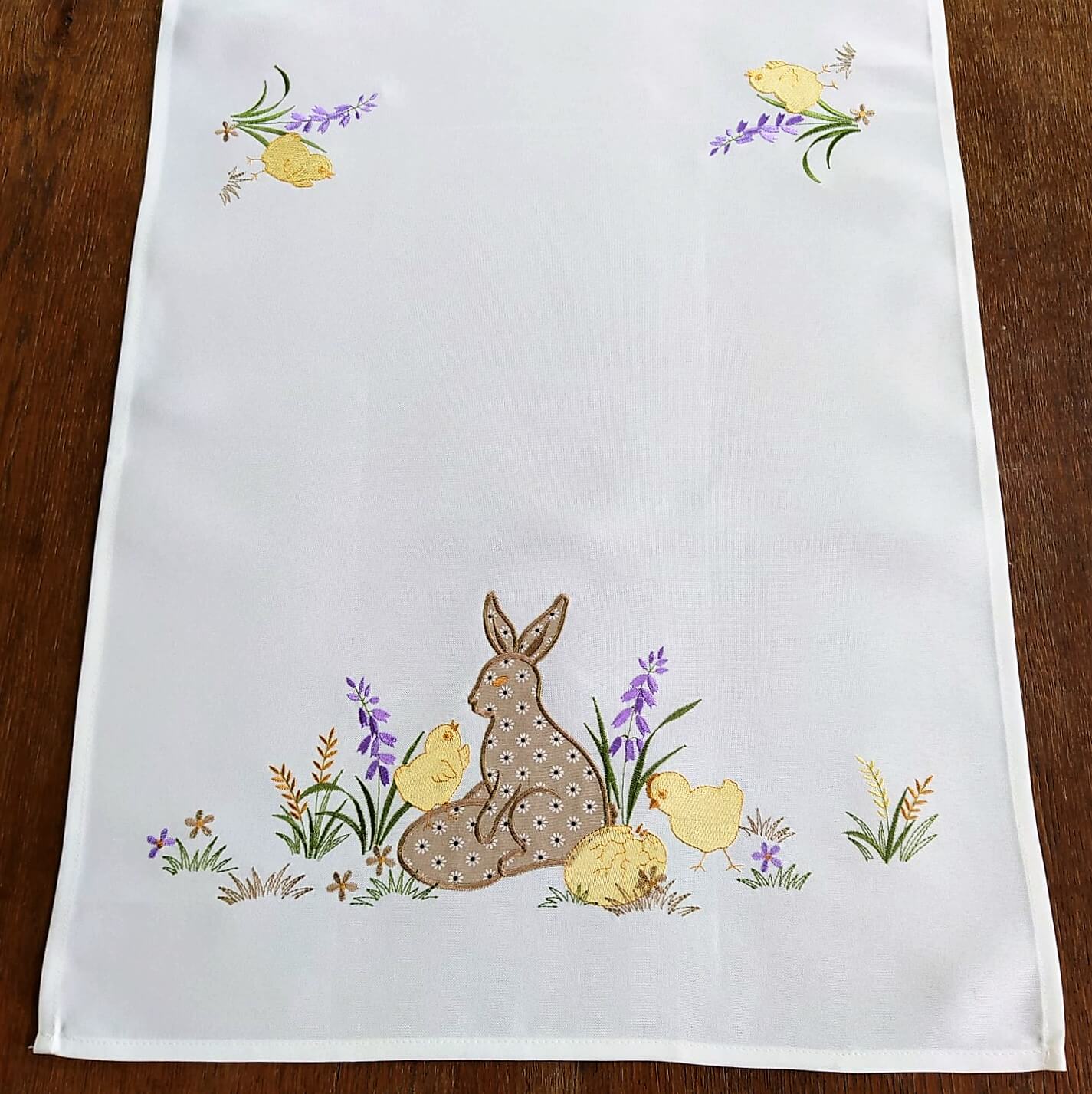 Prostokątny wielkanocny bieżnik 55x120 w kolorze jasnokremowym z aplikacją w postaci brązowego zająca oraz wyhaftowanymi kurczaczkami.