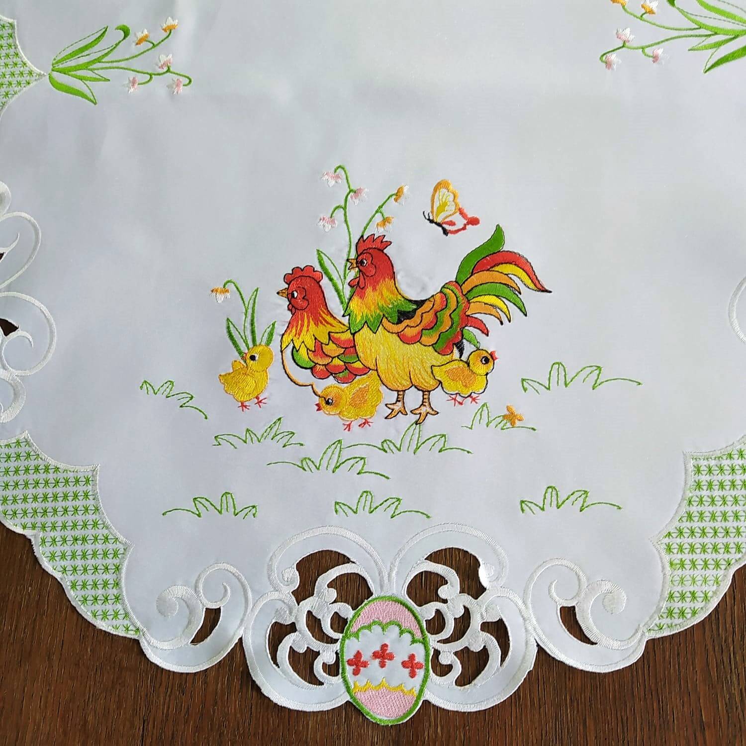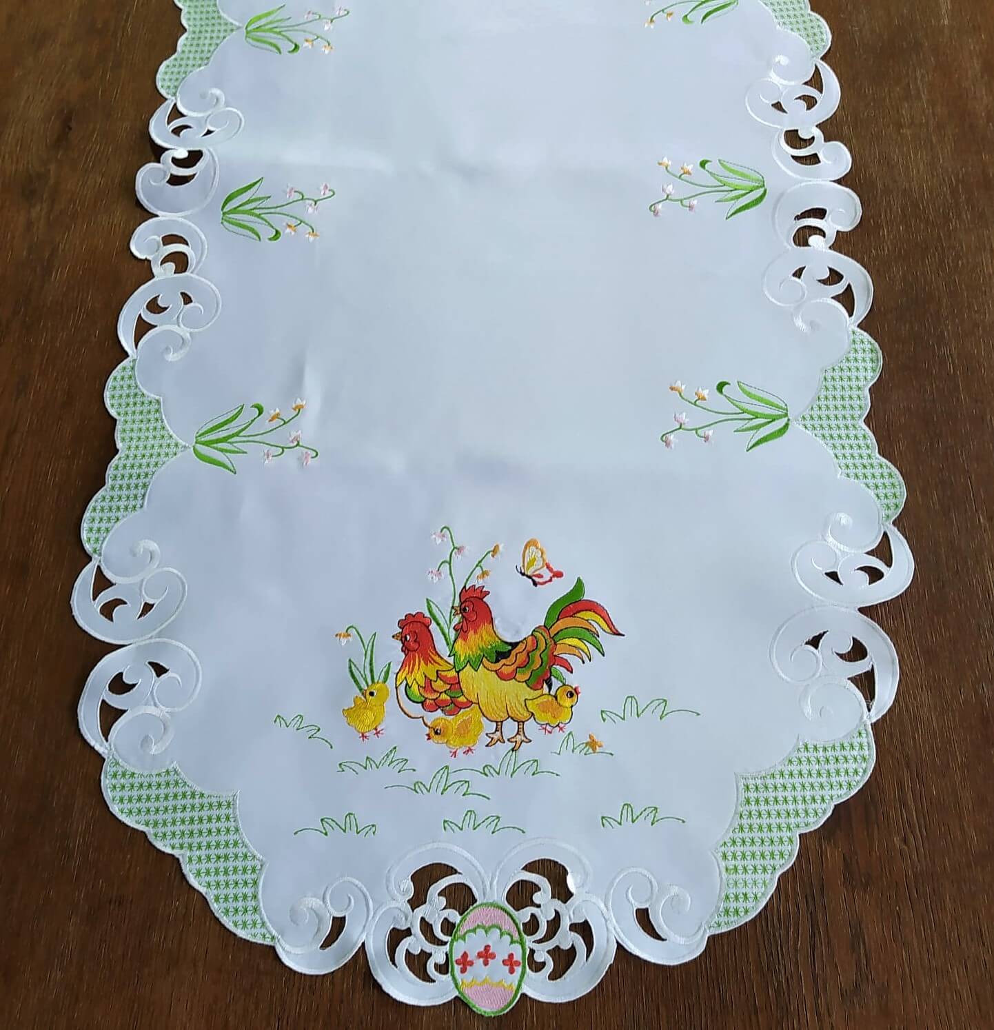 Wielkanocny bieżnik 60x120 w kolorze białym z wyhaftowaną kurzą rodziną